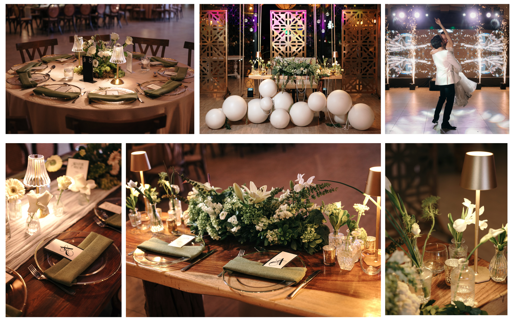 Los detalles en mesa —porta platos transparentes con orilla blanca, servilletas verdes y menús en blanco y negro— completaron una composición visual impecable.